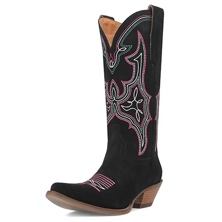 Special Designs: The black boots feature a snip toe and decorative embroidered design.