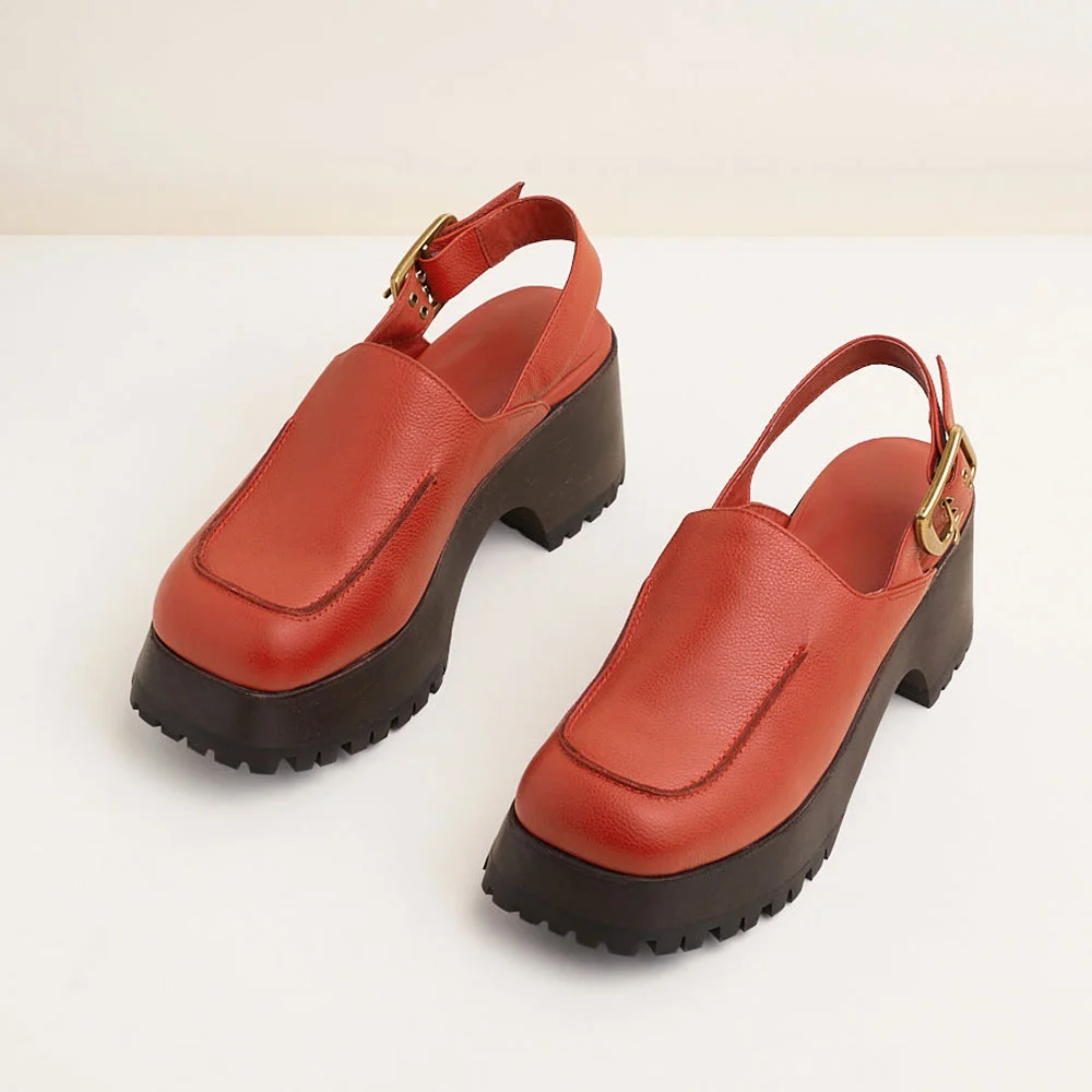 Orange Buckle Chunky Heel Platform Slingback Shoes with Square Toe