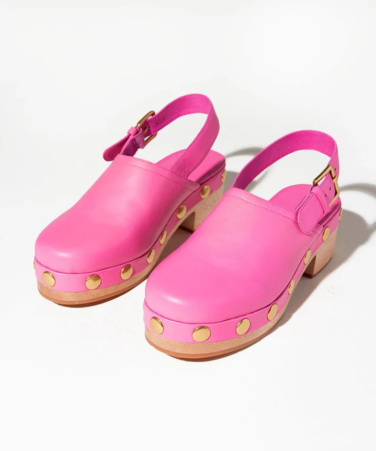 Special Designs :Pink Vegan leather low chunky heels with gold studded design and slingback patteren